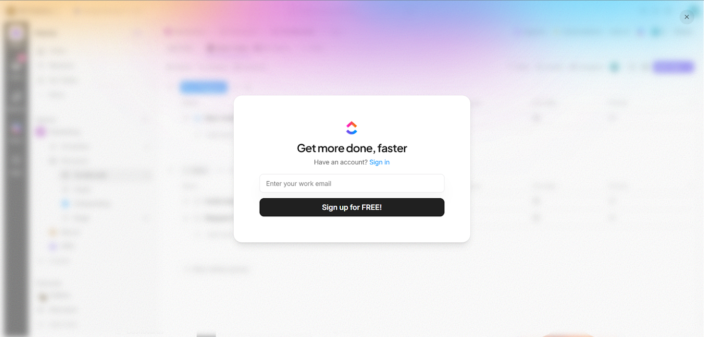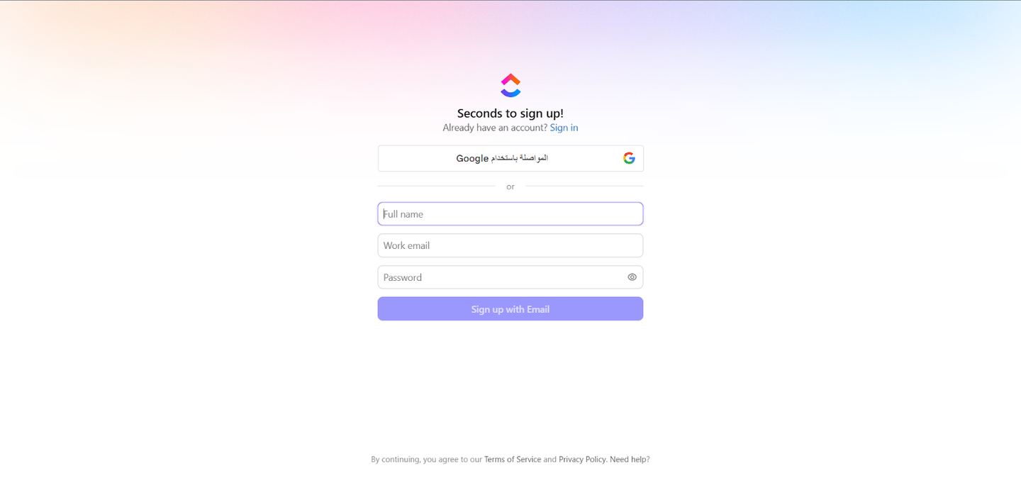 على سبيل المثال، منصة ClickUp تُبسّط عملية التسجيل للمستخدمين في خطوة واحدة فقط، مع طلب المعلومات الأساسية فقط، كما تتيح التسجيل مباشرة عبر حسابات Google.